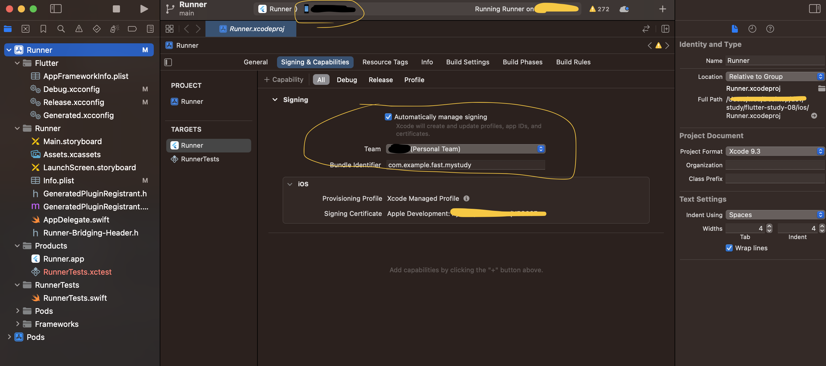 - 아이폰이 정상적으로 연결되어 있다면(기기를 신뢰하냐는 알럿이 뜨면 신뢰를 눌러준다) xcode 에 연결된 아이폰이 나온다. Sigining & Capabilities 를 누른 후 Automatically manage siginig 를 체크하고, 애플 계정에 로그인 한 후 Bundle Identifier 를 작성한다.(다른 프로젝트와 겹치지 않게)