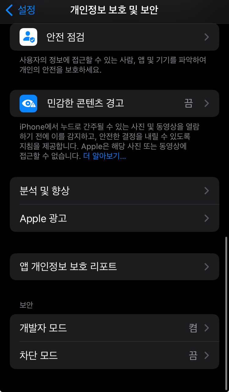 - 아이폰을 연결한 후 아이폰에서 설정 > 개인정보 보호 > 개발자 모드를 활성화 해준다.